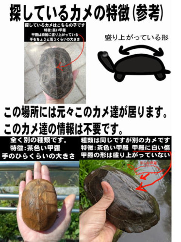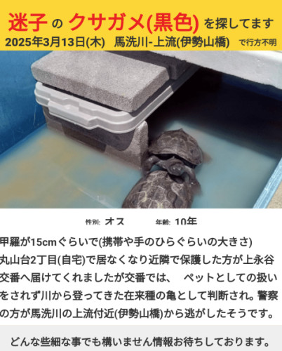 神奈川県横浜市港南区野庭町の馬洗川でカメが迷子になっています。詳細情報はこちら。